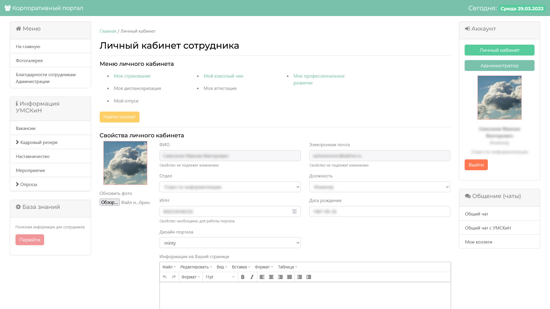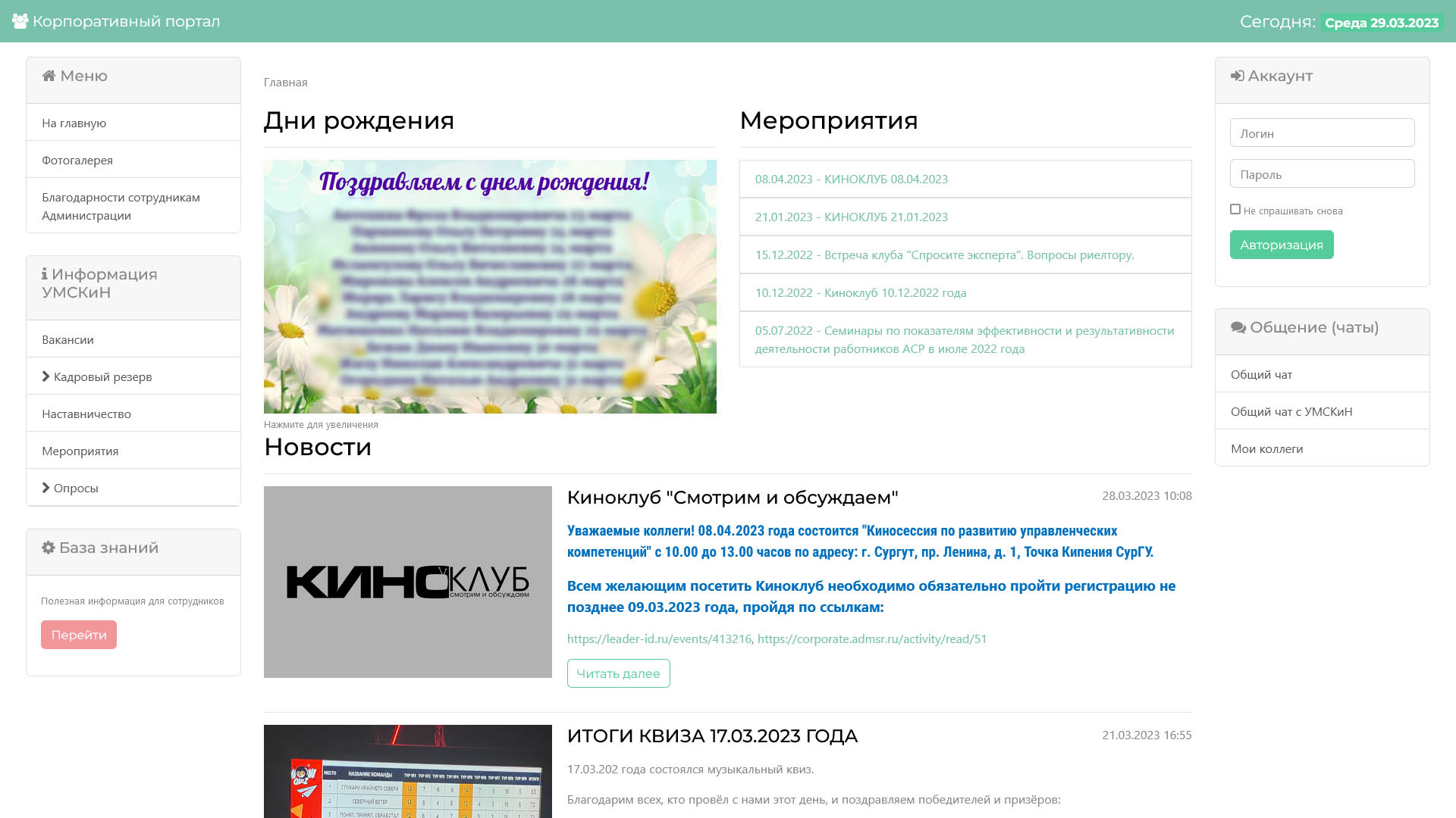 Внутренний корпоративный портал для сотрудников администрации, с возможностью получения данных из 1С.