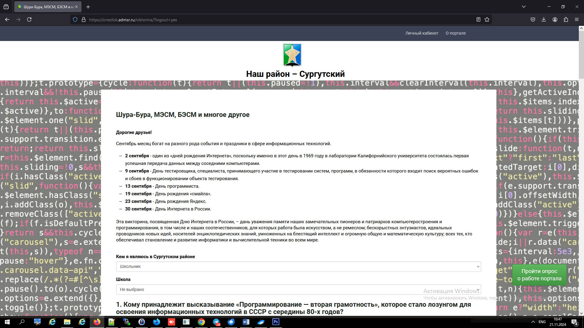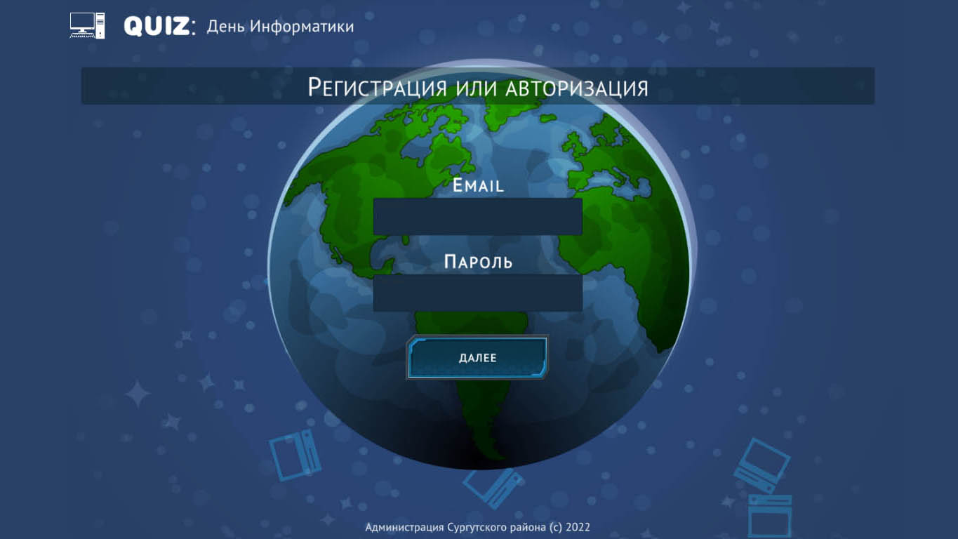 Квиз для школьников Сургутского района с призовым фондом. Создано с использованием 1С - Битрикс и клиентских скриптов JS